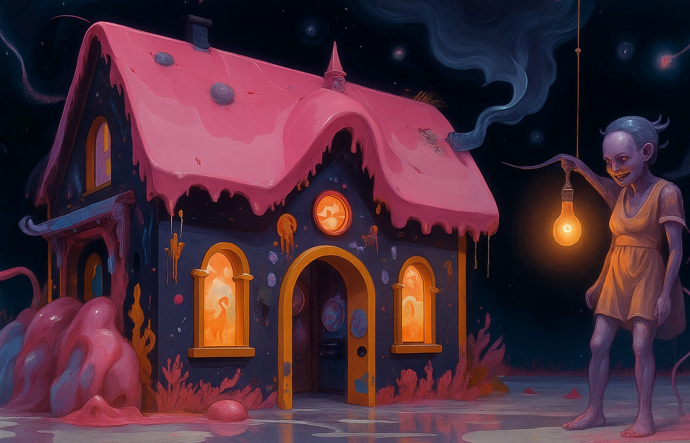 La casa parecía sacada del sueño de un loco. Paredes hechas con ladrillos de Vauquitas, ventanas de miel de caña endurecida con marcos de mantecol que brillaban bajo una lámpara a kerosene, el techo de alfajores aplastados con chocolate goteando. Flan temblando en un rincón, vainillas apiladas, un olor a azúcar quemada que se te pegaba a la cara. Margarita corrió y arrancó un pedazo de marco y un churro relleno. Los metió a la boca. Se metió todo lo que pudo en ella.